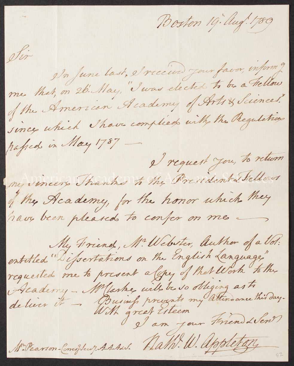 Permit me, as a Friend to all Establishments which have a Tendency to promote useful Knowledge, to congratulate you upon the Institution of the American Academy of Arts and Sciences; and to add my warmest Wishes for the Success of so laudable a Design.
