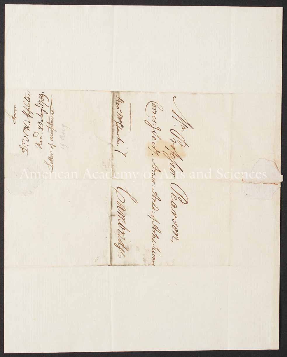 I think myself much honoured by the favour of your letter dated the 28th of Feby last which I received about a month ago. I am made very happy by the information it contains that, in the midst of war and the most important struggle that a people were ever engaged in, a new Academy for promoting arts and Sciences has been established at Boston. In compliance with your desire, I have communicated the incorporating Act and list of members to the President and Secretaries of the Royal Society, attended with a letter of my own stating the contents of your letter to me, and the hopes wch: the American Academy entertain that the Royal Society, governed by the neutrality of Philosophy, will favour it with its encouragem:t. I do not yet know what notice will be taken of these communications. The reply that has been reported to me from the President is that it has not been customary to lay before the