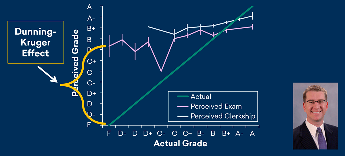 What we see is that the top people underestimate themselves a little bit, while the people at the bottom are getting F’s and D’s on the exam, but they think they’re getting a B or a B minus. On the clerkship itself, they think they’re getting a B plus when they’re actually at the bottom of their class. Those who don’t know don’t seem to know that they don’t know, and they don’t have the expertise that they thought they had. There’s a gap at the bottom.