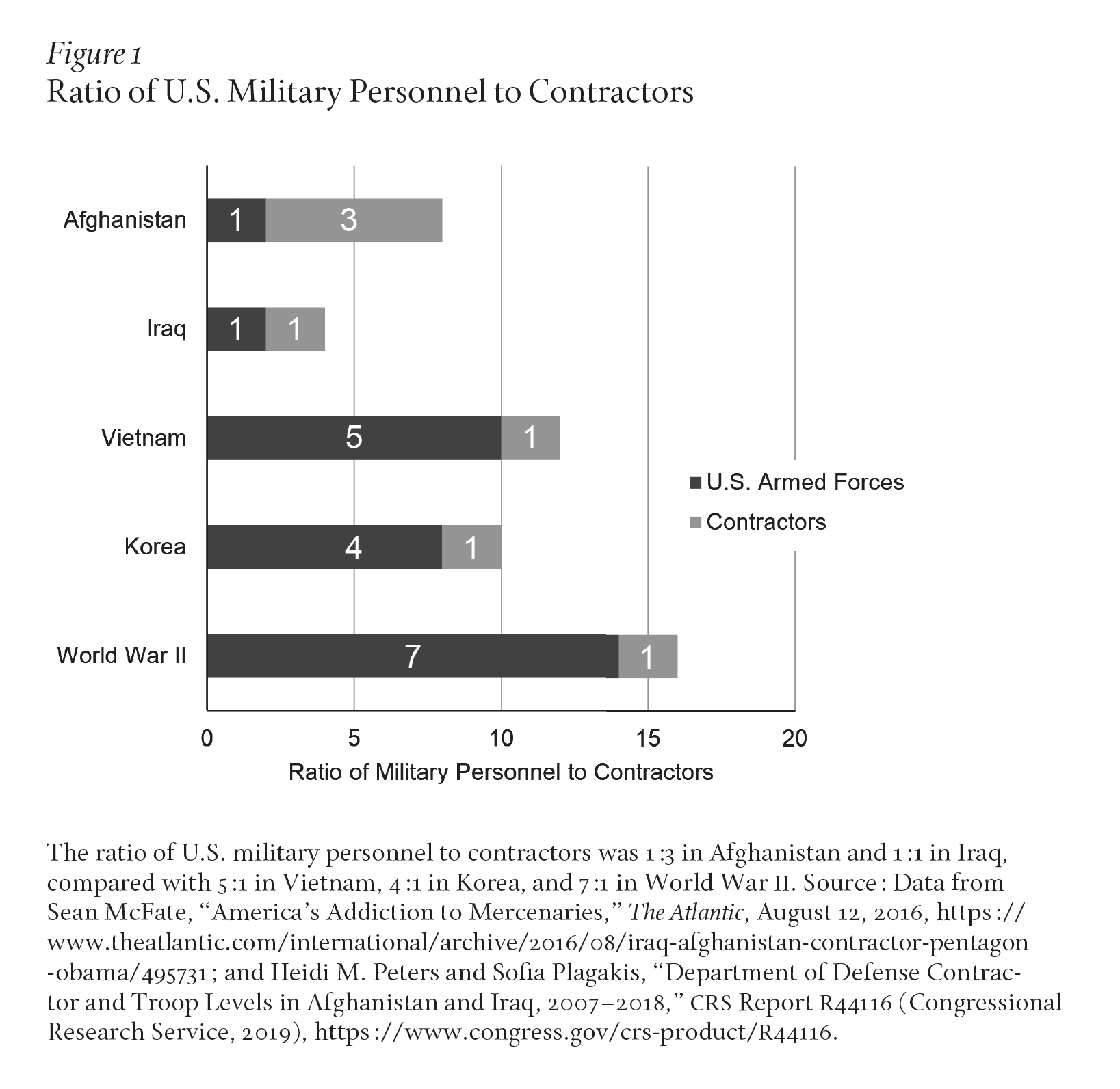 Virtually every activity and line item in the war appropriations included activities performed by private contractors. For the majority of two decades, the number of private contractors working in the Iraq and Afghanistan war zones exceeded the number of uniformed military troops (see Figure 1).