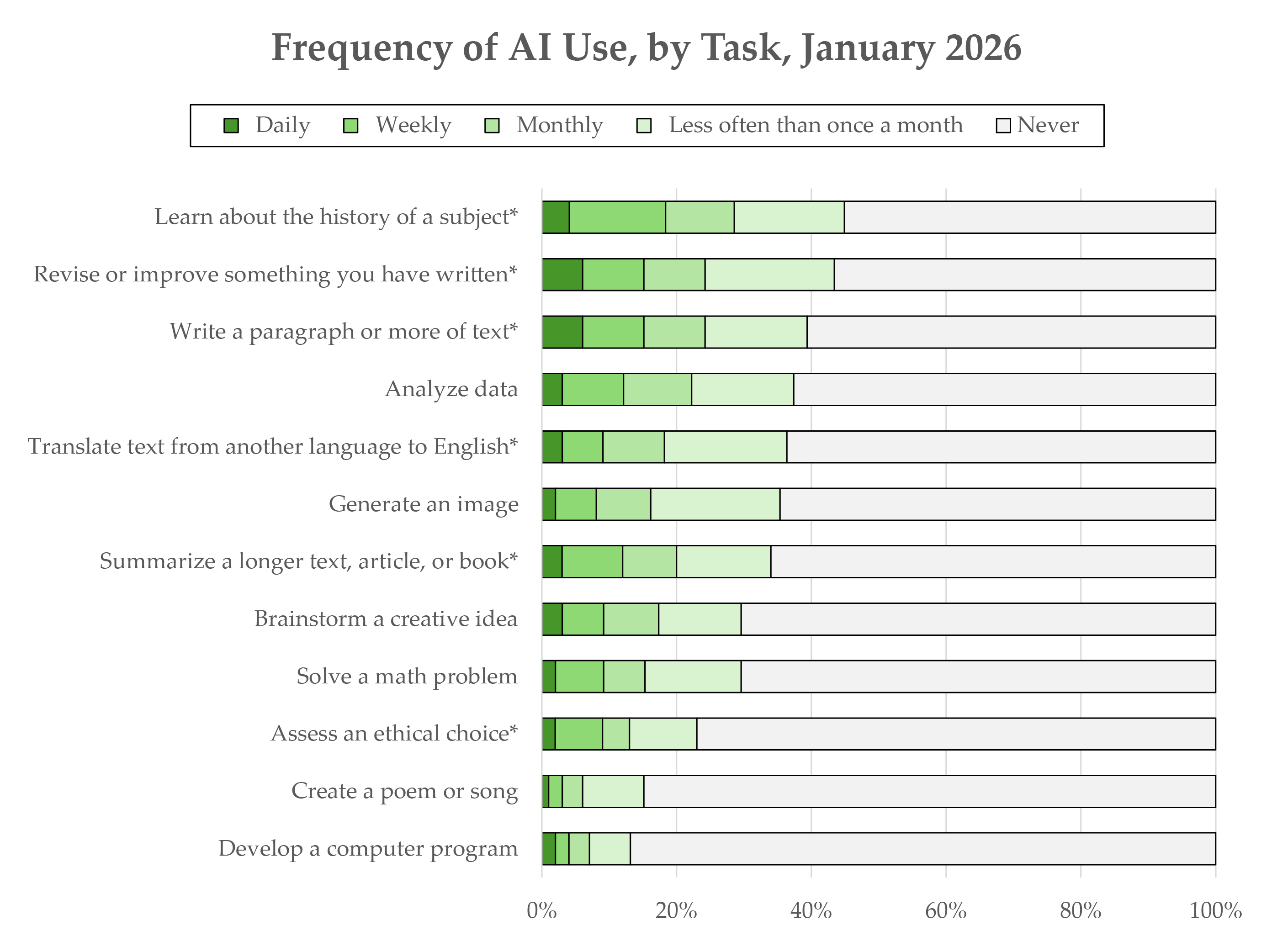 The Indicators fielded a question on the January 2026 NORC AmeriSpeak Omnibus survey, asking a representative sample of American adults how often they use AI to conduct a variety of common tasks.1 Most of the surveyed tasks were humanities-related (including learning about the history of something; writing, revising, and summarizing a text; translating from another language; or considering an ethical problem). For comparative purposes, the survey also asked about some STEM-related tasks (solving a math problem, developing a computer program, or analyzing data) and some artistic activities (generating an image or creating a program or song). A final task, brainstorming a creative idea, potentially encompasses all three fields.2